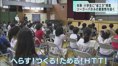 東京都は脱炭素化の一環としてソーラーパネルの設置の義務化を図る考えで、現在、有識者による会議で一戸建て住宅など新築の建物への義務付けを検討しています。この夏にも逼迫(ひっぱく)することが懸念される電力について、東京都はHTT=電力を「へらす・つくる・ためる」というキャッチコピーを掲げていて、授業でも子どもたちにHTTを呼びかけました。