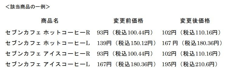値上げ率は税別価格で約10~20%程度で、「セブンカフェ ホットコーヒーR」「セブンカフェ アイスコーヒーR」は100円から110円に値上げする。「セブンカフェ ホットコーヒーL」は150円から180円に変更。