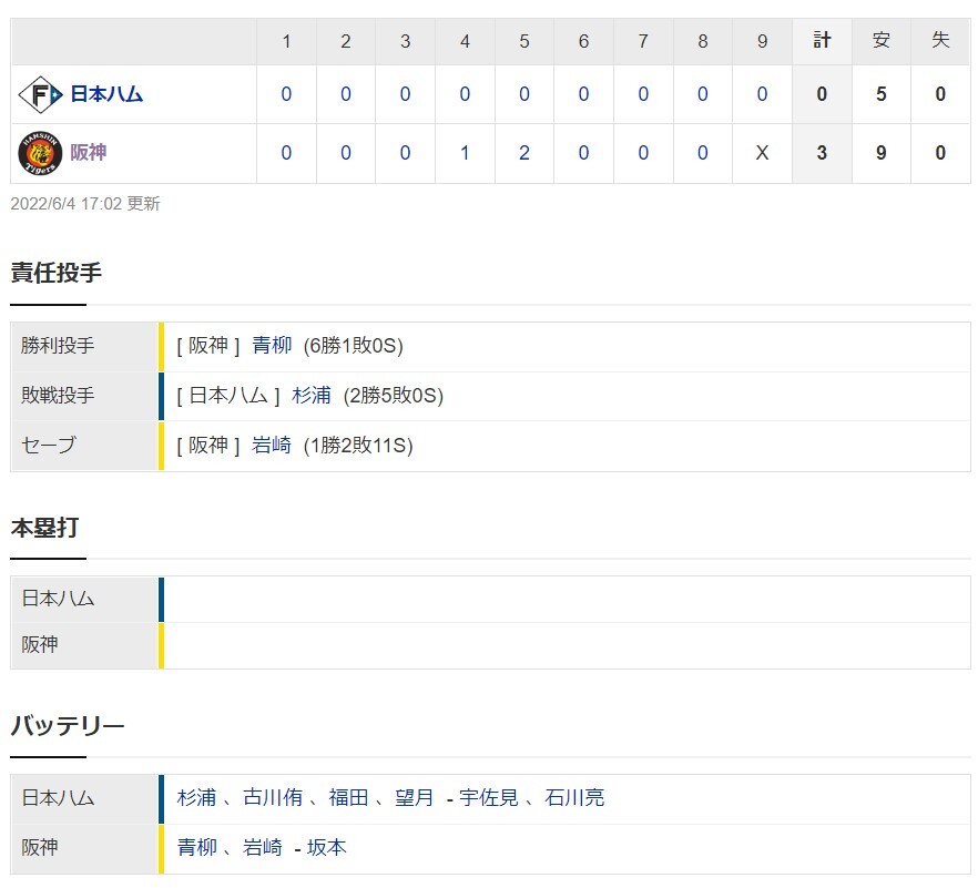 【交流戦】阪神3ー0日本ハム 試合結果 甲子園球場 2022/6/4