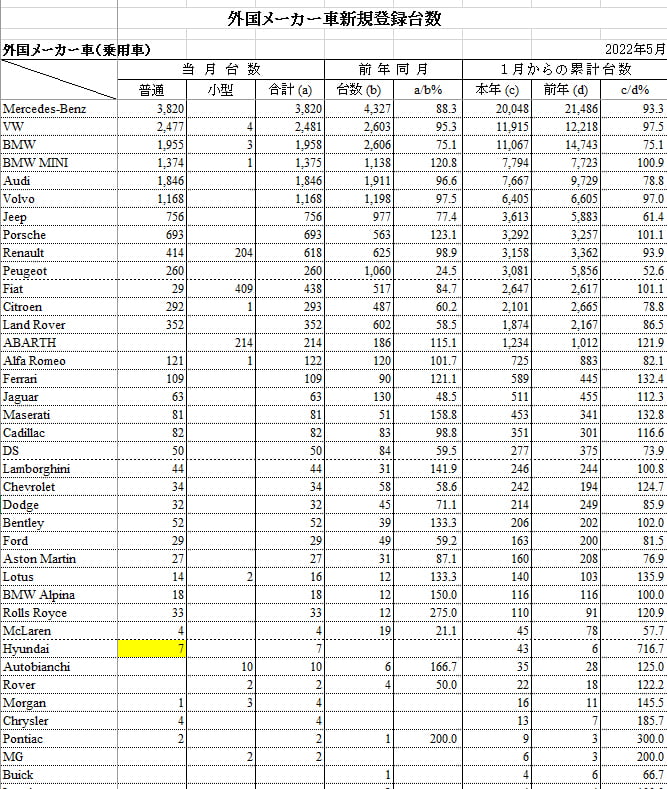 納車開始は07月の予定ですので、いまだ日本進出の成果は表れていないと見るべきですが、2022年06月06日、『日本自動車輸入組合』から「05月の輸入車登録台数速報」が出ましたのでご紹介しておきます。