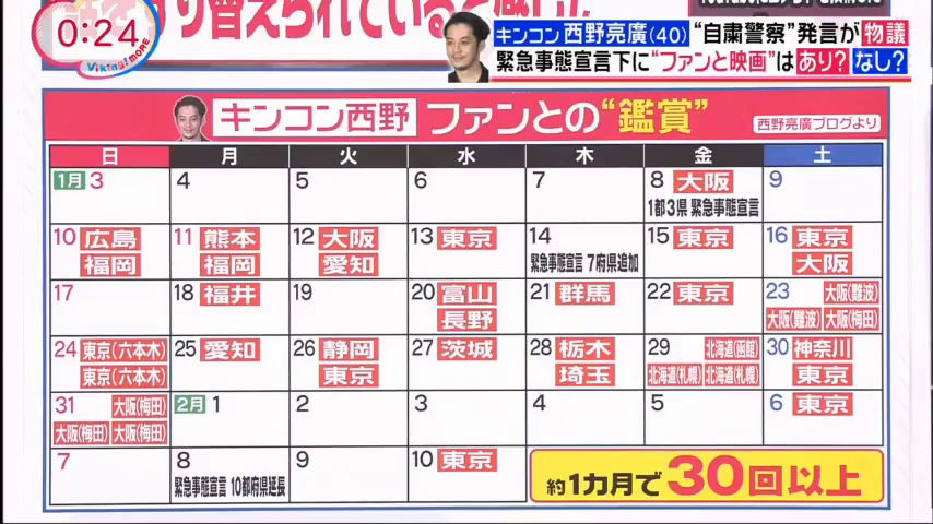 番組では、西野が鑑賞した劇場でともに映画を見た男性を電話取材した。500を超える客席はほぼ満員で、西野はルールにのっとった鑑賞だったというが、一部には「良かったよ!」、「西野さーん!」と呼びかける観客もいたという。番組によると、劇場は感染症対策にのっとって営業をしているという。