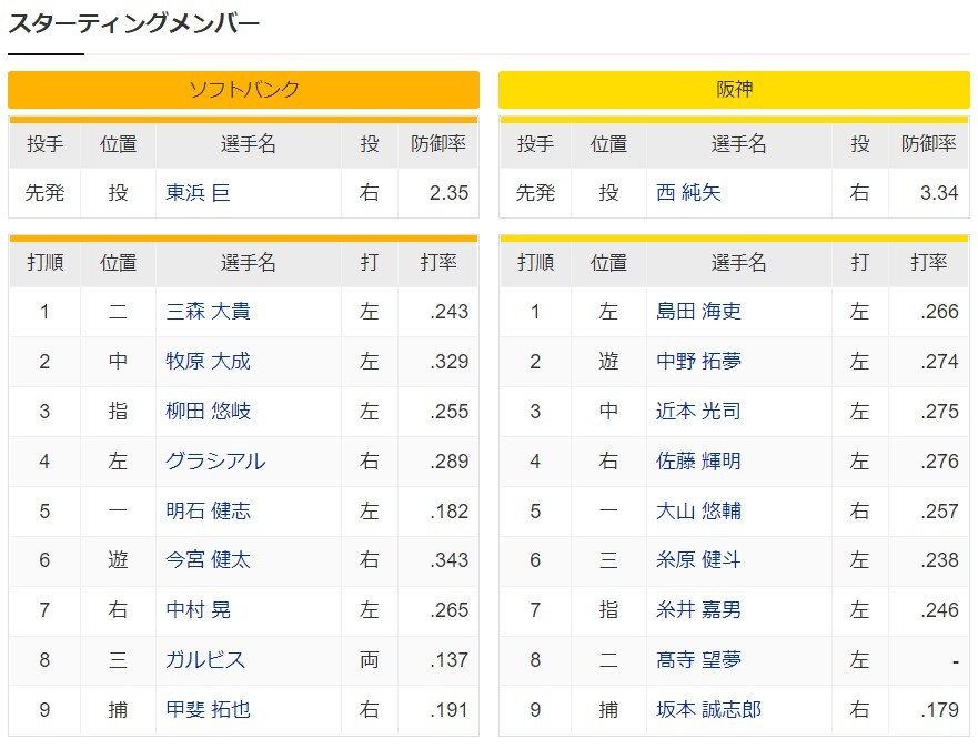 【交流戦】ソフトバンクー阪神 スタメン PayPayドーム 2022/6/8
