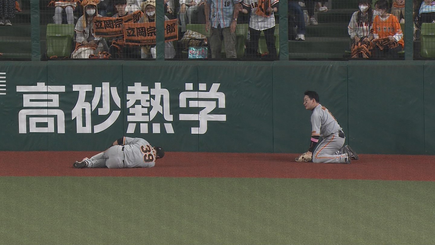 九回の守備、外崎選手のフライを追いかけた中堅 #丸佳浩 選手と右翼 #立岡宗一郎 選手が交錯。丸選手がフライをキャッチしたが、立岡選手が立ち上がれず、担架で退場。左脚を抑えて悶絶#巨人 #giants #ジャイアンツ