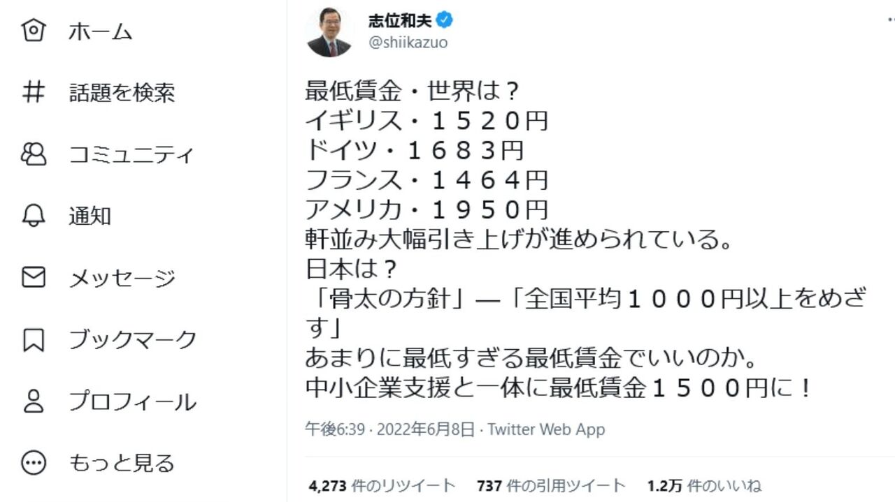 【パヨク】「アメリカの最低賃金は1950円」 志位和夫委員長がツイッターでフェイクニュースを拡散