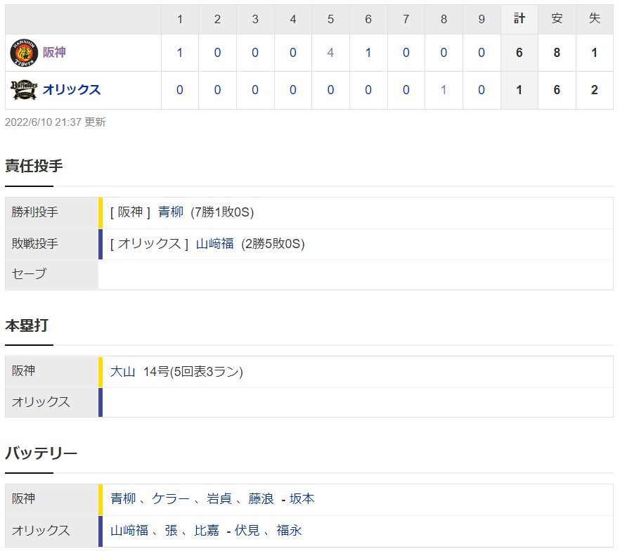 【交流戦】オリックス1ー6阪神 試合結果 京セラドーム大阪 2022/6/10