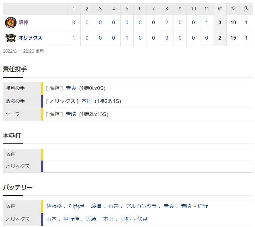 【交流戦】オリックス2ー3阪神 試合結果 京セラドーム大阪 2022/6/11