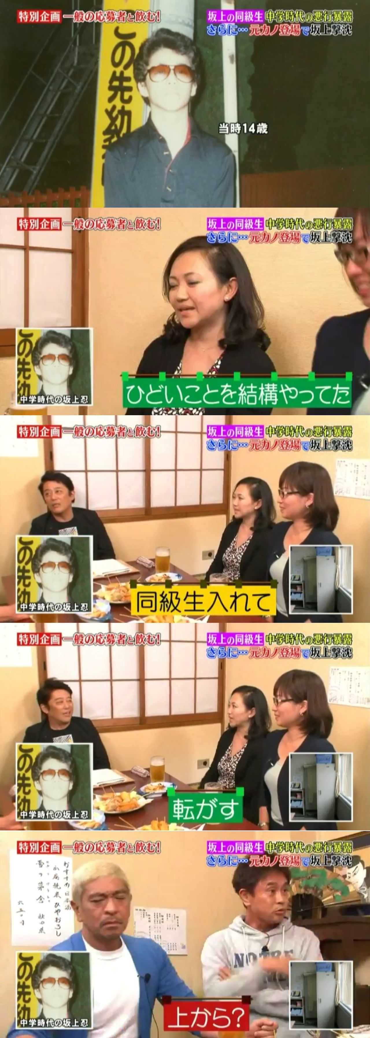 ・中学時代のクラスメート曰く、「(坂上は)ひどいことを結構やってた。同級生を教室のロッカーに入れて上から転がしてた」