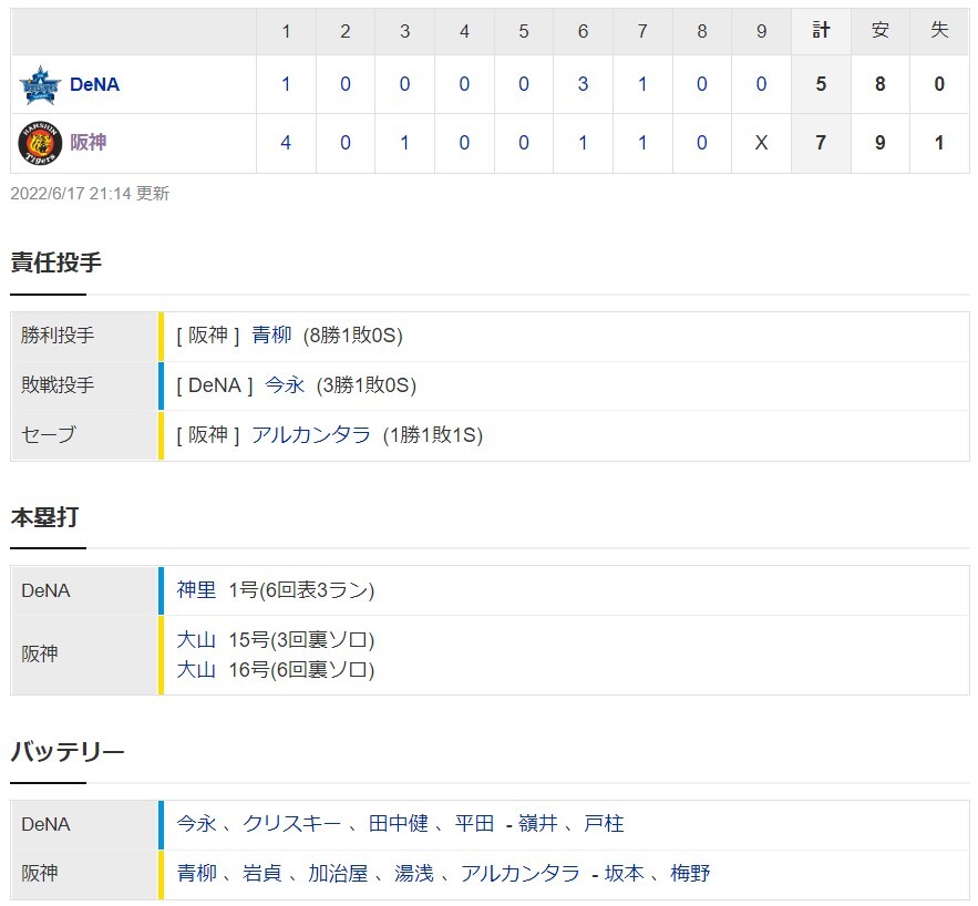阪神7ー5DeNA 試合結果 甲子園球場 2022/6/17