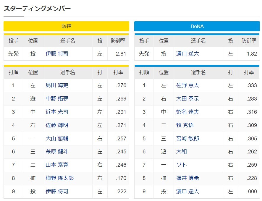 阪神ーDeNA スタメン 甲子園球場 2022/6/18