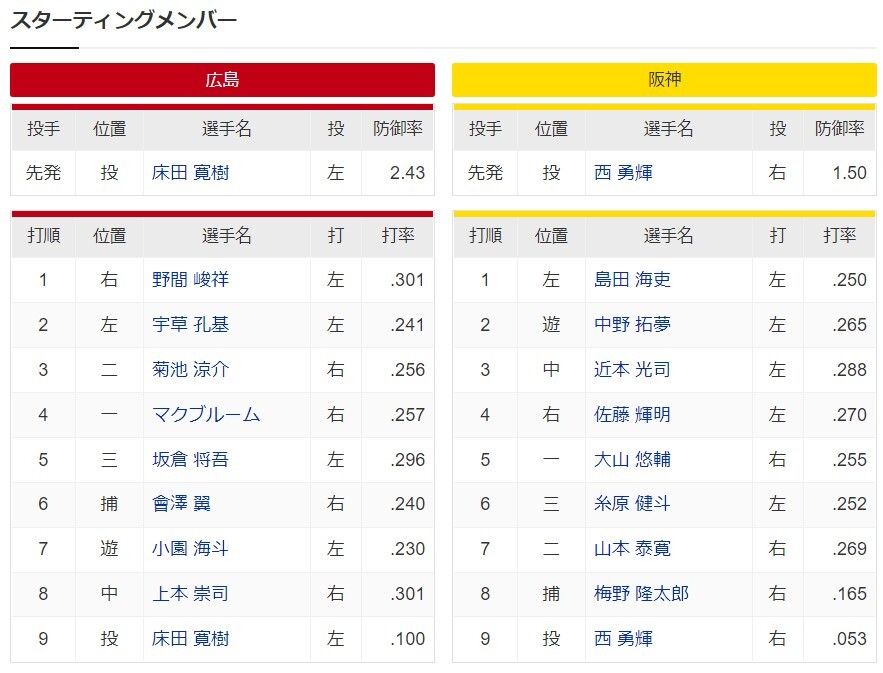 広島ー阪神 スタメン マツダスタジアム 2022/6/21
