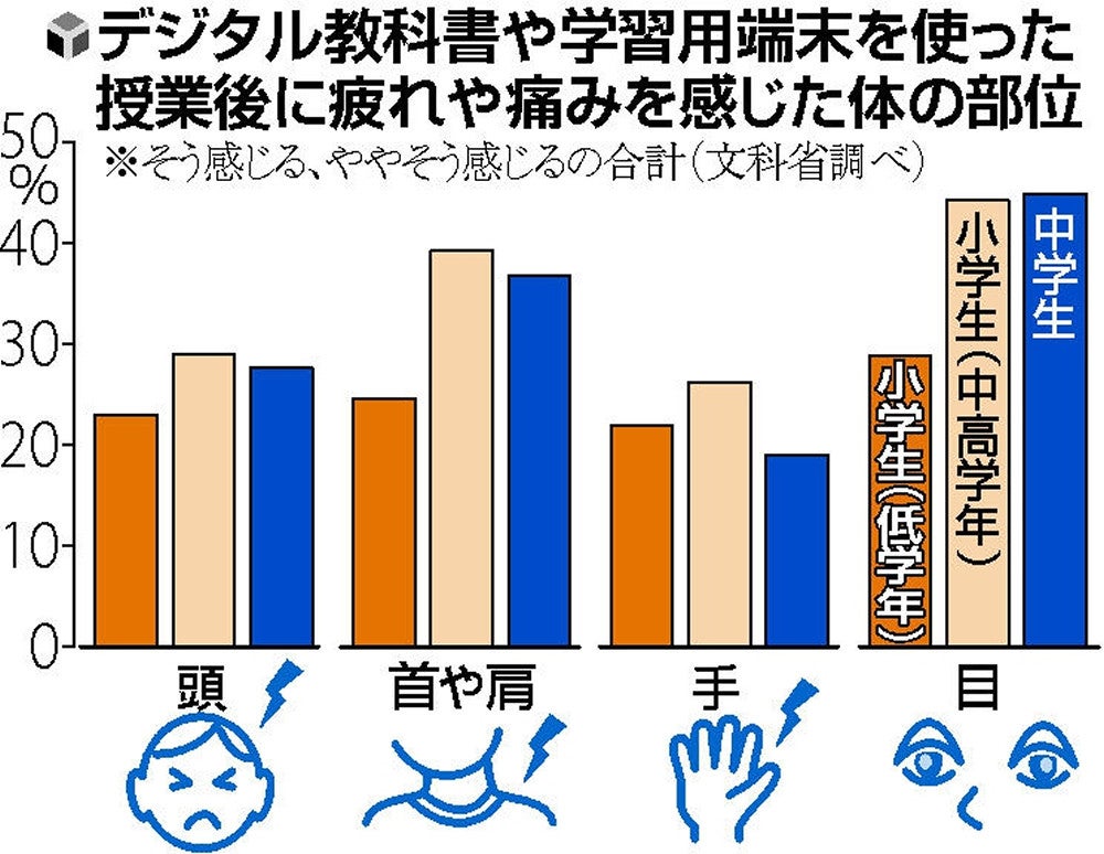 文部科学省が2021年度、全国の4割の小中学校で行ったデジタル教科書の実証事業の結果をまとめた。2~4割の児童生徒が授業後に目や首、肩などに疲れや痛みを感じていて、健康面への影響が明らかになった。