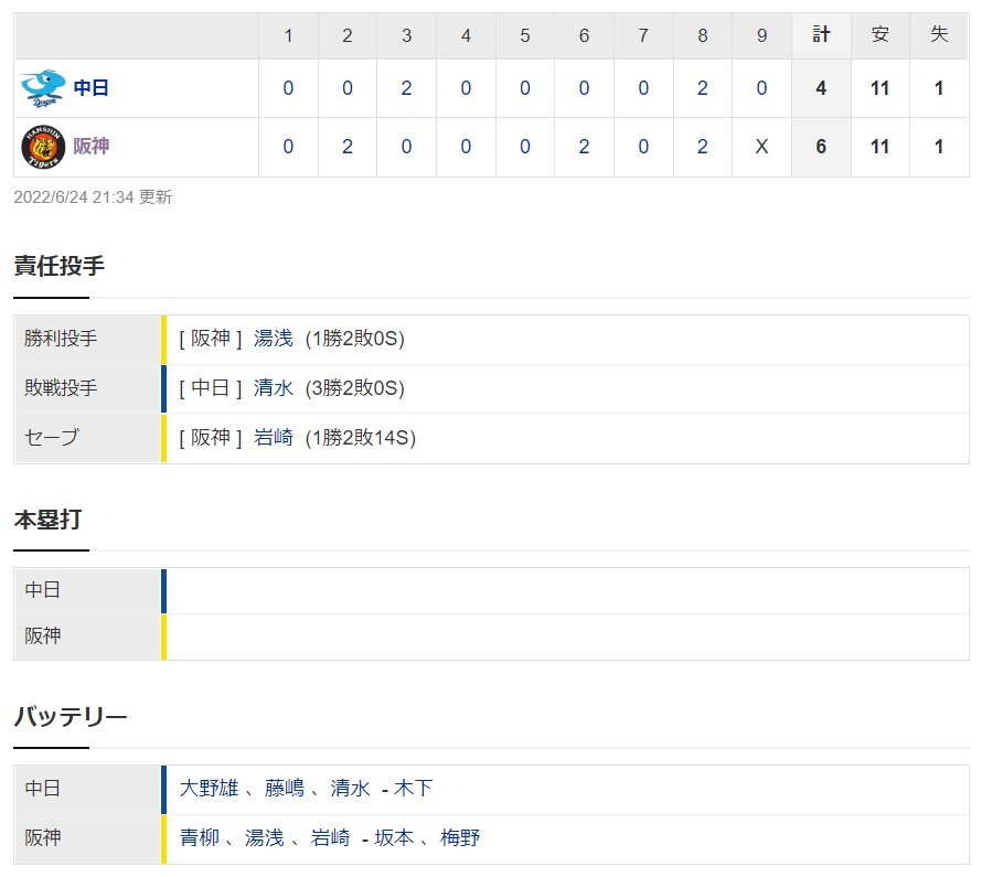 阪神6ー4中日 試合結果 甲子園球場 2022/6/24