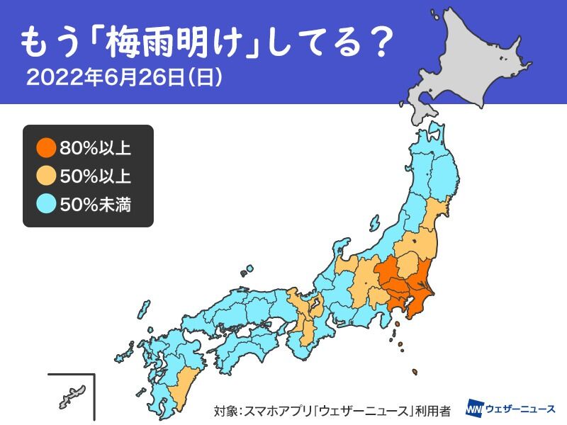 東海の6月中の梅雨明けは63年(6月22日ごろ)以来、九州南部は55年(6月24日ごろ)以来。【遠山和宏】