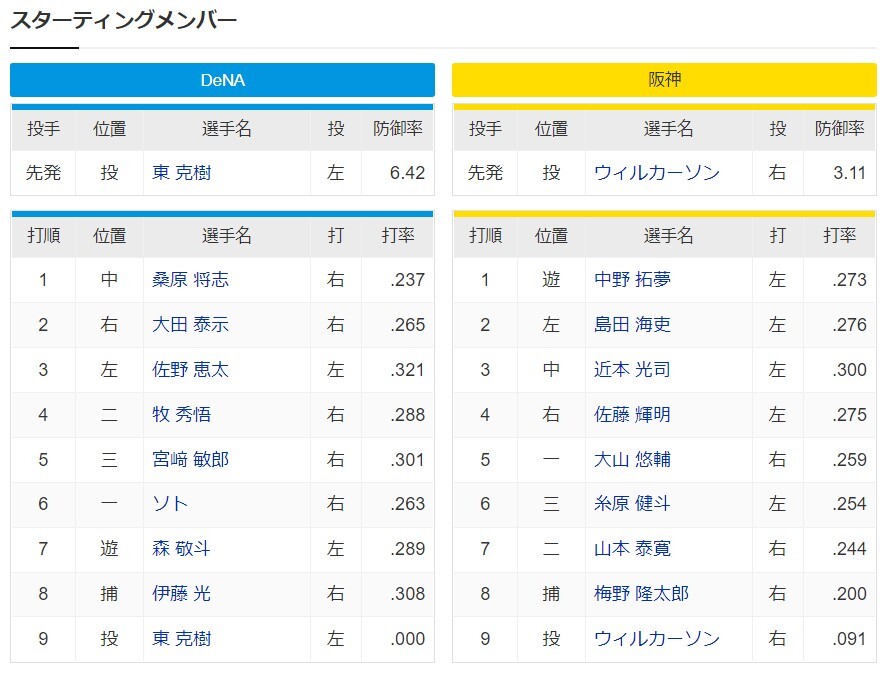 DeNAー阪神 スタメン 横浜スタジアム 2022/6/30