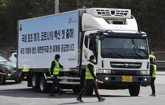 アストラゼネカ新型コロナウイルスワクチンに対し、国内で初めての出荷が始まった今月24日、慶尚北道安東市(キョンサンブクド・アンドンシ)SKバイオサイエンス工場から出荷されたワクチン輸送車が京畿道利川(キョンギド・イチョン)の物流センターで到着している様子。