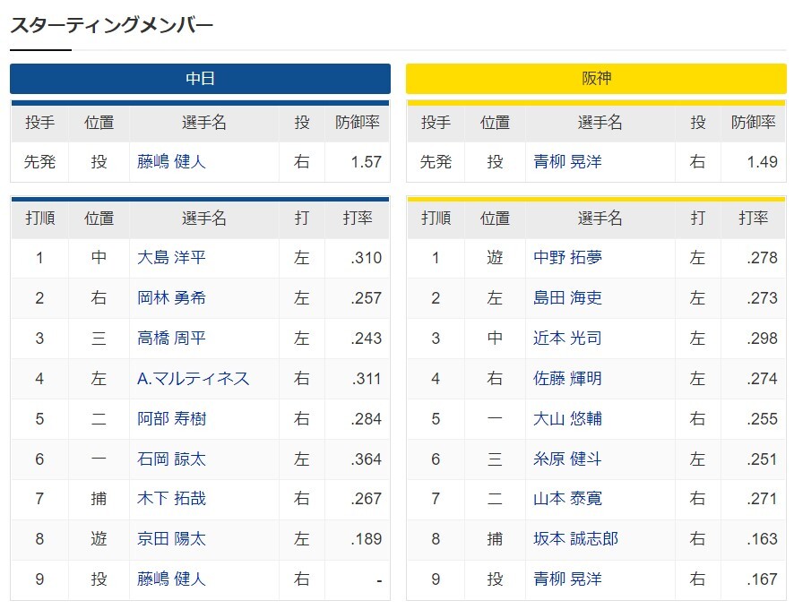 中日ー阪神 スタメン バンテリンドーム 2022/7/1