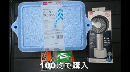 簡易クーラーを作ると投稿者のえんじにあさん。100均で材料を購入しました。ただしハンディ扇風機は500円です。