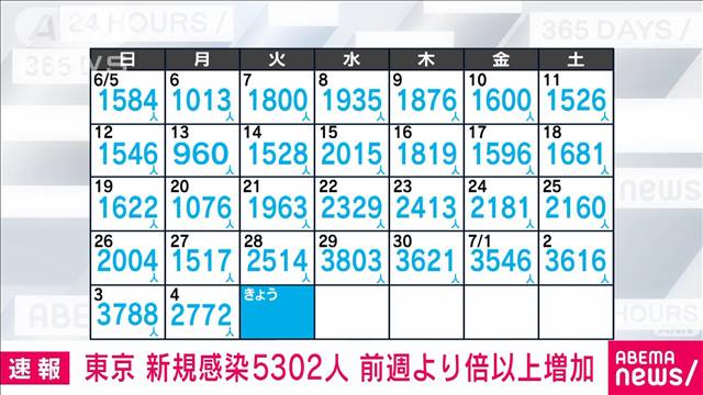 東京都内で5日、新たに5302人の新型コロナウイルスへの感染が確認されました。先週火曜日(6月28日)から2788人増え、18日連続で前週の同じ曜日の人数を上回っています。