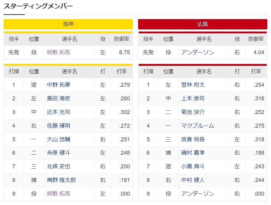 阪神ー広島 スタメン 甲子園球場 2022/7/7