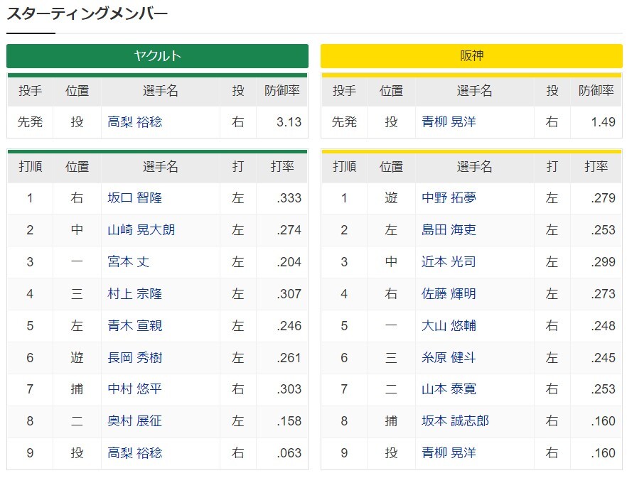 ヤクルトー阪神 スタメン 神宮球場 2022/7/8
