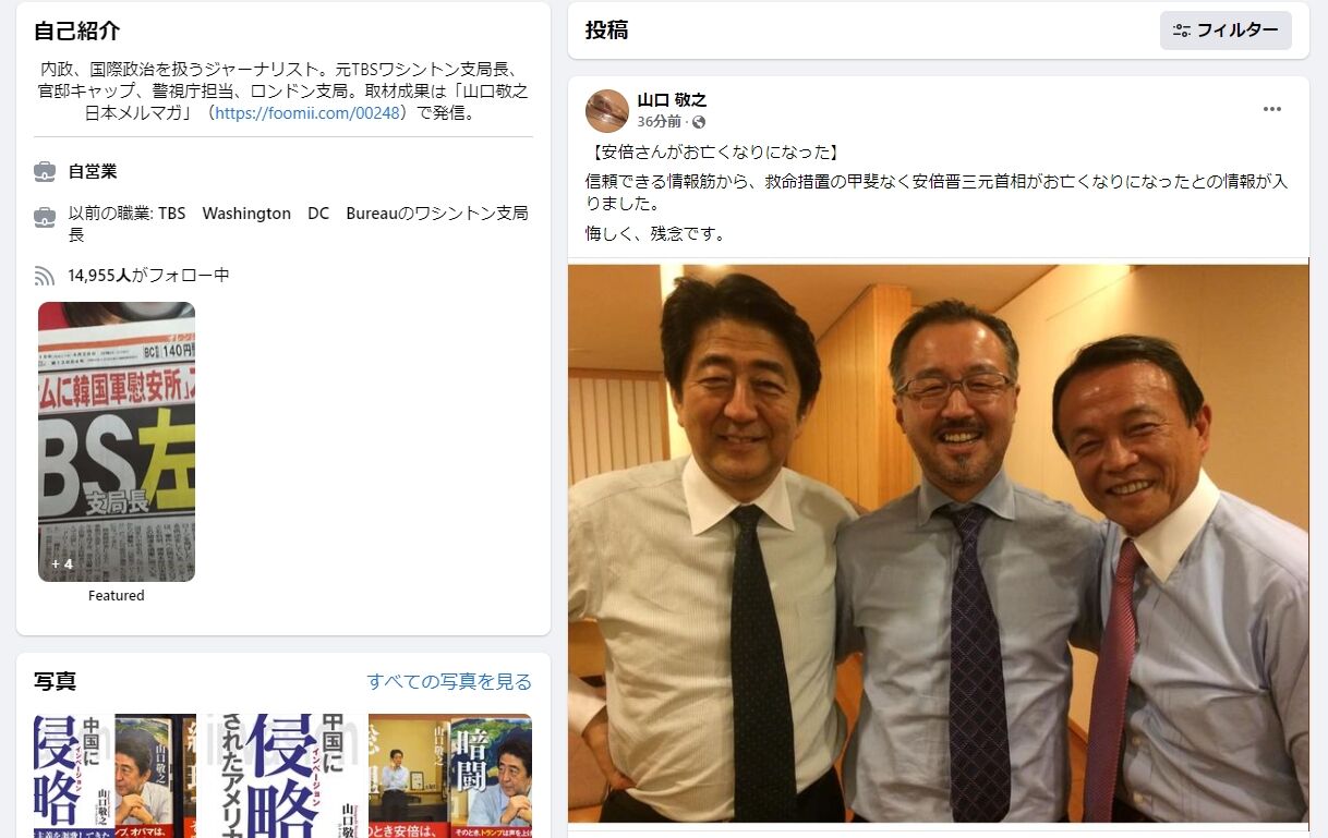 【速報】安倍元首相、死去との情報 元TBSワシントン支局長がFBで発信