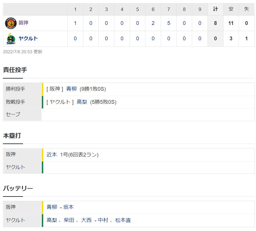 ヤクルト0ー8阪神 試合結果 神宮球場 2022/7/8