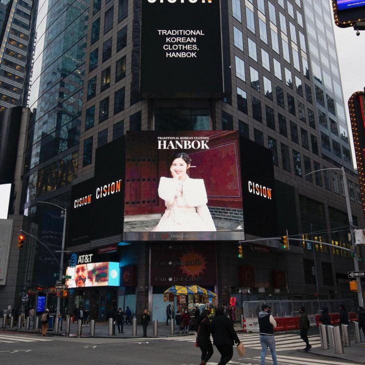 26日、ファッション ブランド、ラカイコリア(LAKAI KOREA)は公式SNSを通じて米国タイムズスクエア電光掲示板に韓服を着て登場したチョン・ヒョソンの写真を掲載しました。