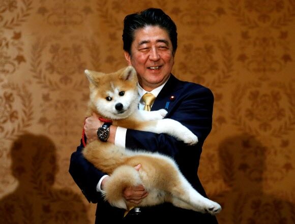 ▲ 日本の安倍晋三総理(当時)がロシアのモスクワで、ロシアのフィギュアスケート金メダリストであるアリーナ・ザギトワにプレゼントした秋田犬とポーズを取っている。