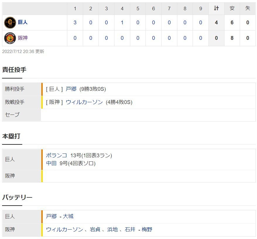 阪神0ー4巨人 試合結果 甲子園球場 2022/7/12