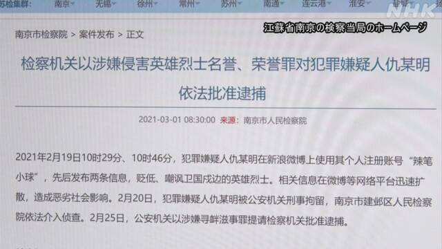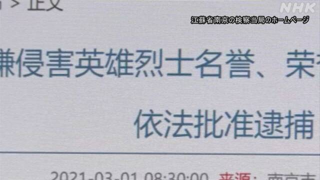 そして、南京の検察は1日、仇氏について「英雄の名誉を傷つけ社会に悪影響を及ぼした」などとして、逮捕を許可したと発表しました。