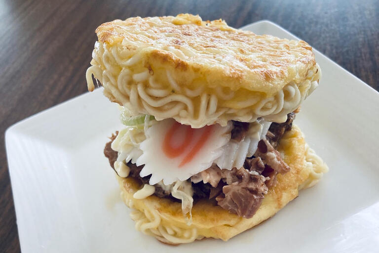 に見立てて堅焼きした麺に、豚の角煮、地鶏、メンマ、ナルト、ネギなどの具材を挟むみしょうゆ味のラーメンスープにとろみをつけたソースで味付けをしている。