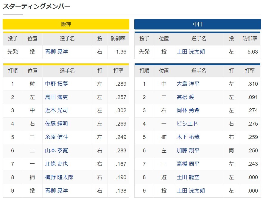 阪神ー中日 スタメン 甲子園球場 2022/7/15
