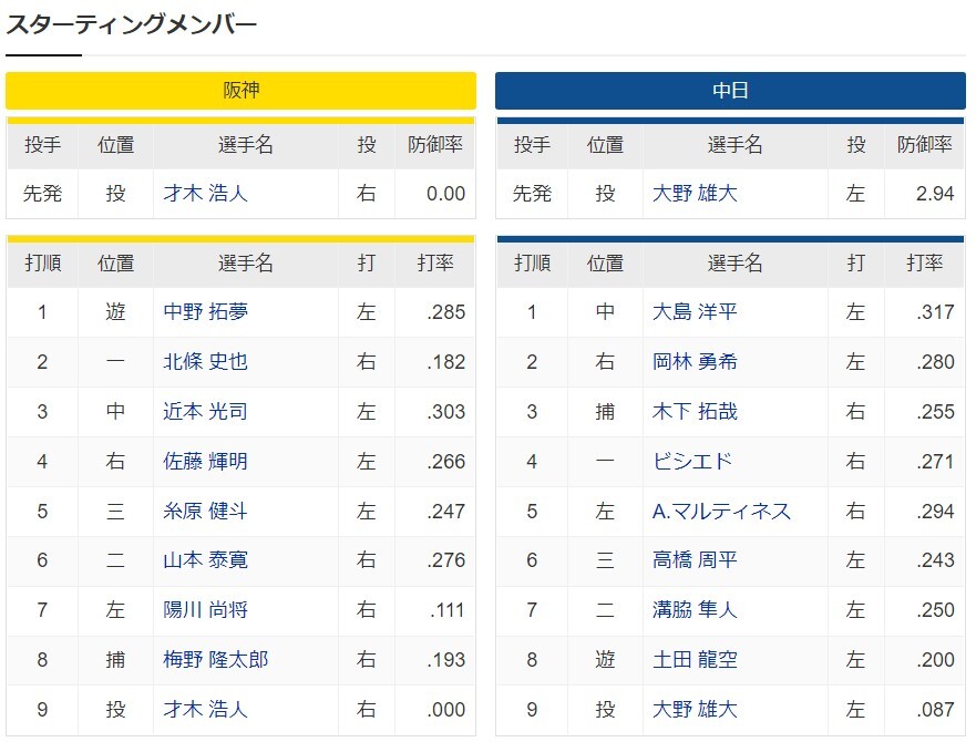 阪神ー中日 スタメン 甲子園球場 2022/7/16