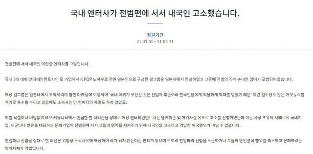 三一節(サムイルチョル)をむかえた去る1日、大統領府国民請願掲示板に「国内エンタメ企業が戦犯方に立って内国人を告訴しました」というタイトルの請願文が掲載された。