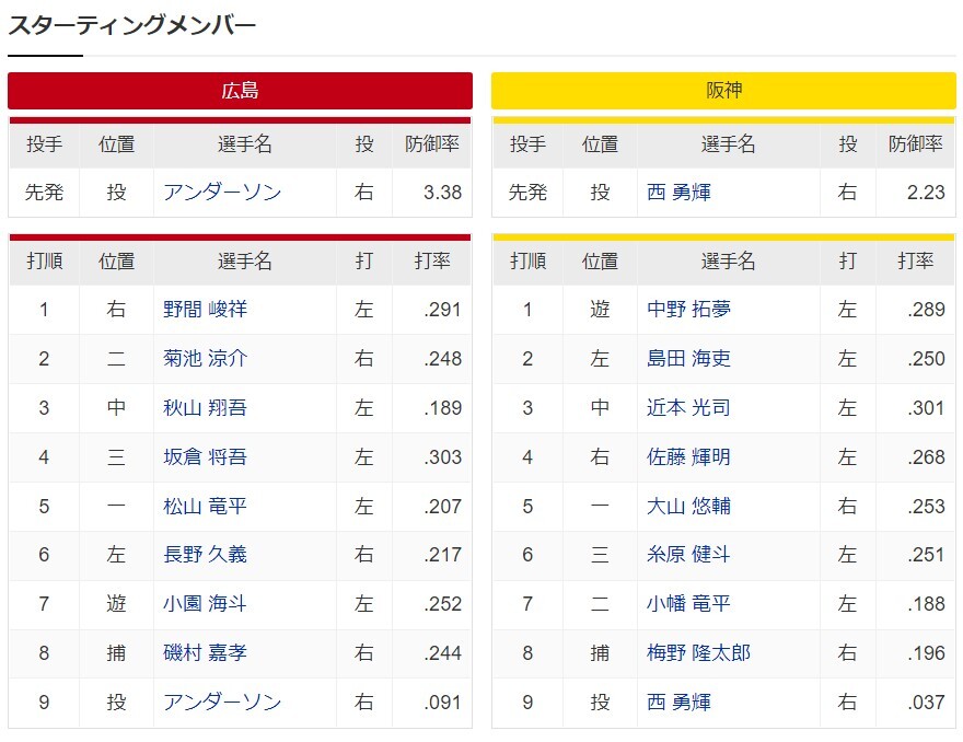 広島ー阪神 スタメン マツダスタジアム 2022/7/20