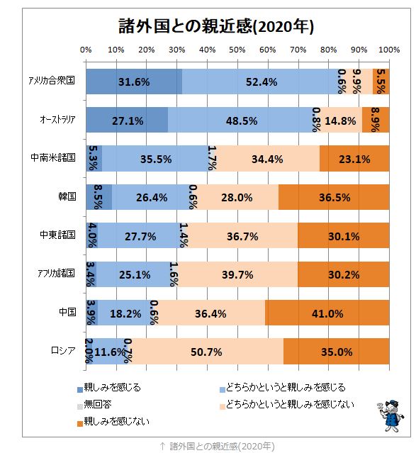 留意すべきは赤系統色の回答部分。「(どちらかというと)親しみを感じない」は回答者の心境的に「親しみの対象にならない」(無関心的な部分。「無回答」とは異なる)と「憎悪の対象となる」の2通りに解釈できる、可能性として存在すること。赤系統色の回答率が多い国・地域が、日本から「憎まれている」との解釈には必ずしもたどり着かない。単に好まれていない、親しみを覚える対象にはならないだけの話。