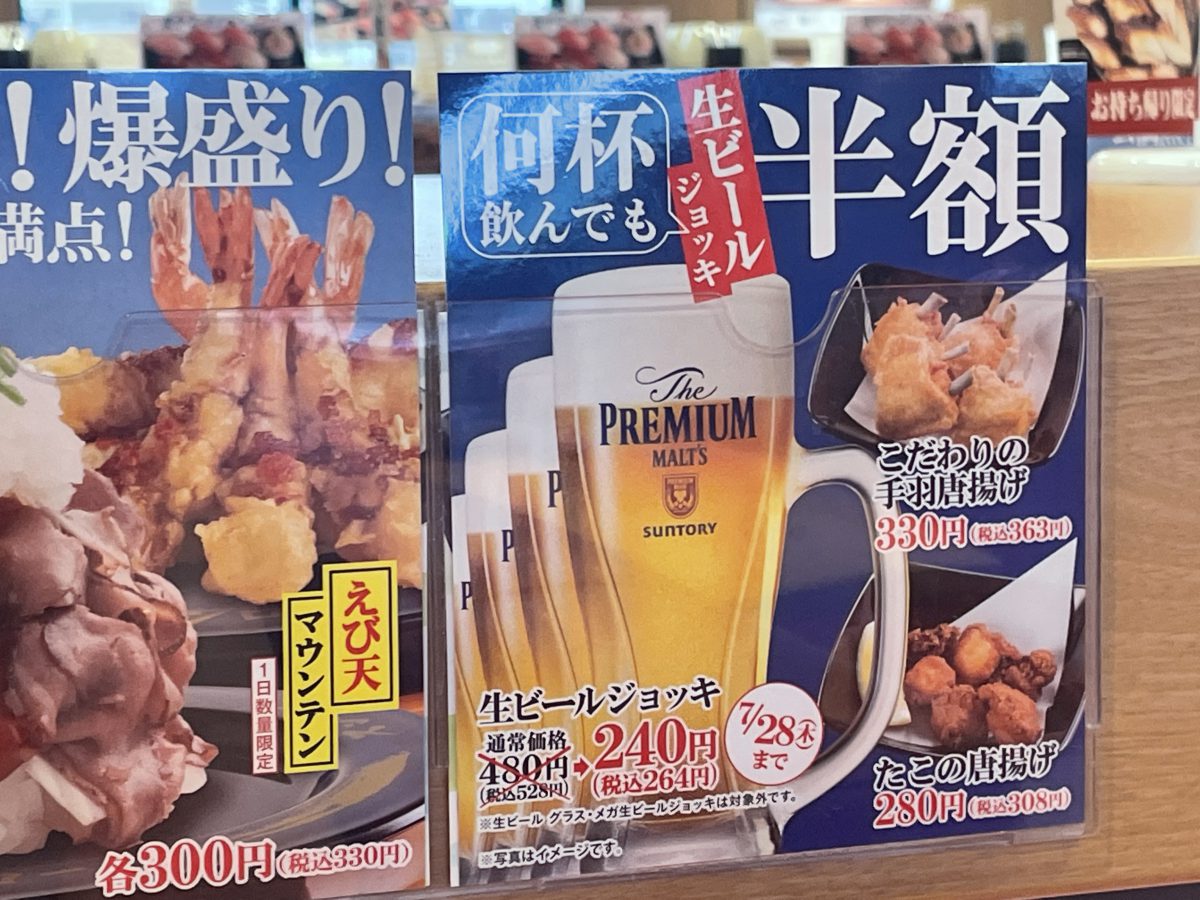 スシローは2022年7月13日から28日の期間、税込528円の生ビールが何杯飲んでも半額になるキャンペーンを実施している。