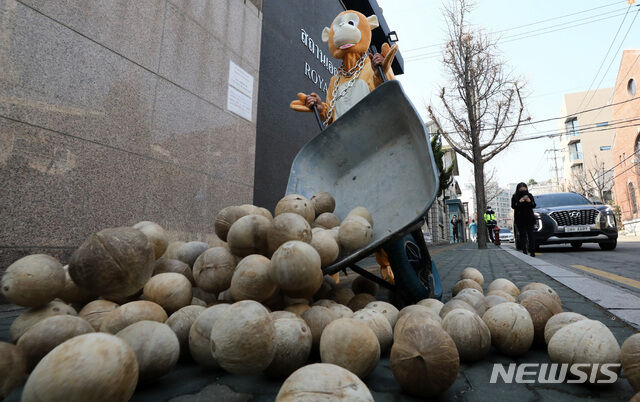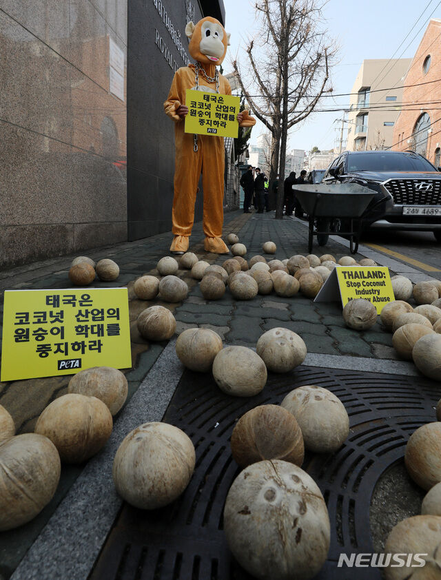 ソウル市竜山区の駐韓タイ大使館前で5日午後、ある動物権利運動家が、サルの恰好をしてココナッツを捨てるパフォーマンスを行っている様子。