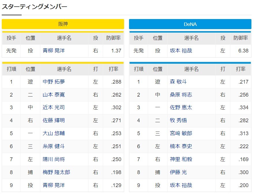 阪神ーDeNA スタメン 甲子園球場 2022/7/22