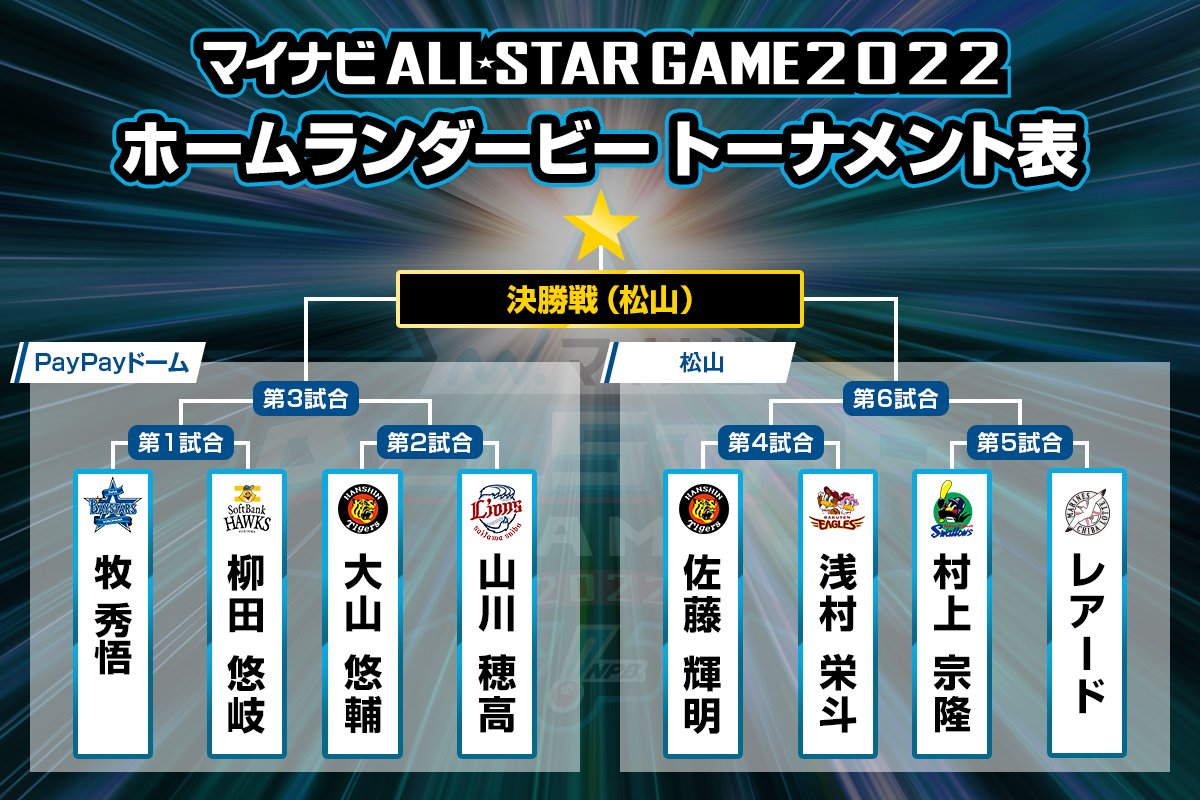 日本野球機構(NPB)は25日、マイナビオールスターゲーム2022(26日=ペイペイドーム、27日=松山)の試合前に実施されるホームランダービーの組み合わせを発表した。