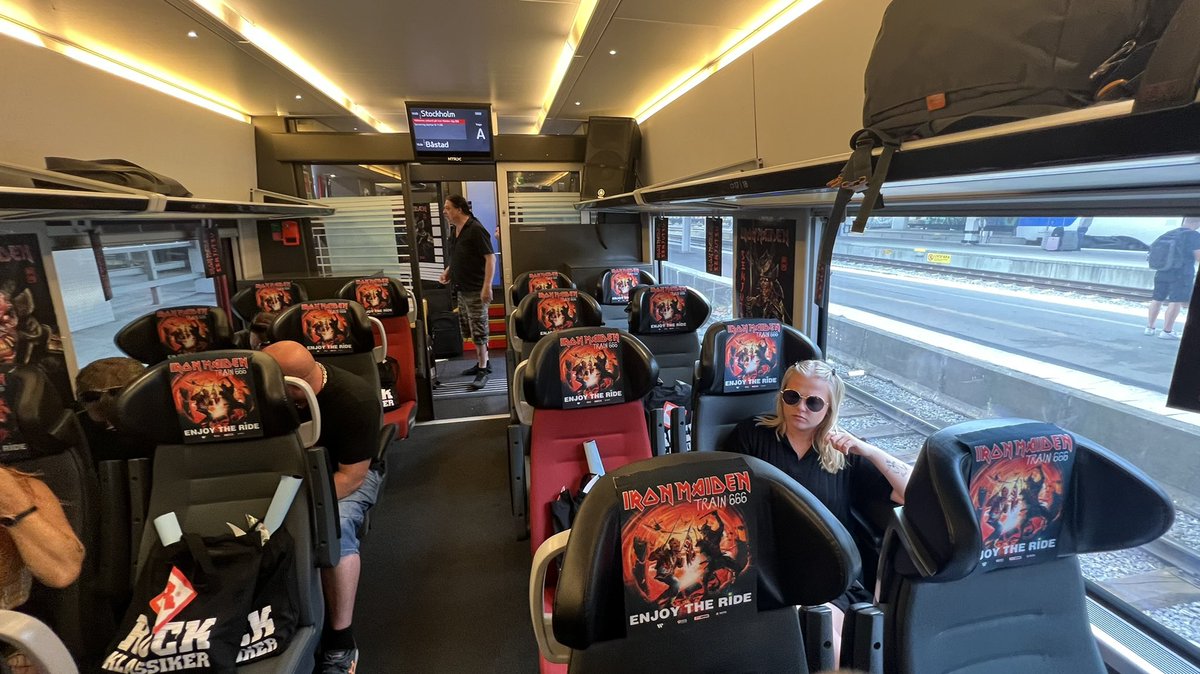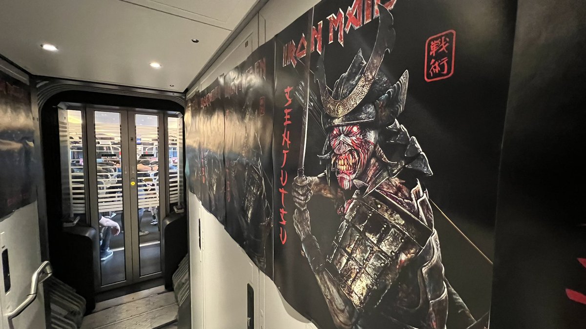 先週金曜日(7月22日)、ファン約300人がそれに乗り込み、ヨーテボリで開かれた公演へ向かったそうだ。列車の外観だけでなく、シートや飲み物もアイアン・メイデンづくしとなった。その上、乗客には、エディのマスク、ポスター、「Stratego」と「The Number Of The Beast」が収録されたヴィニール盤などが入ったお土産も振舞われたそうだ。