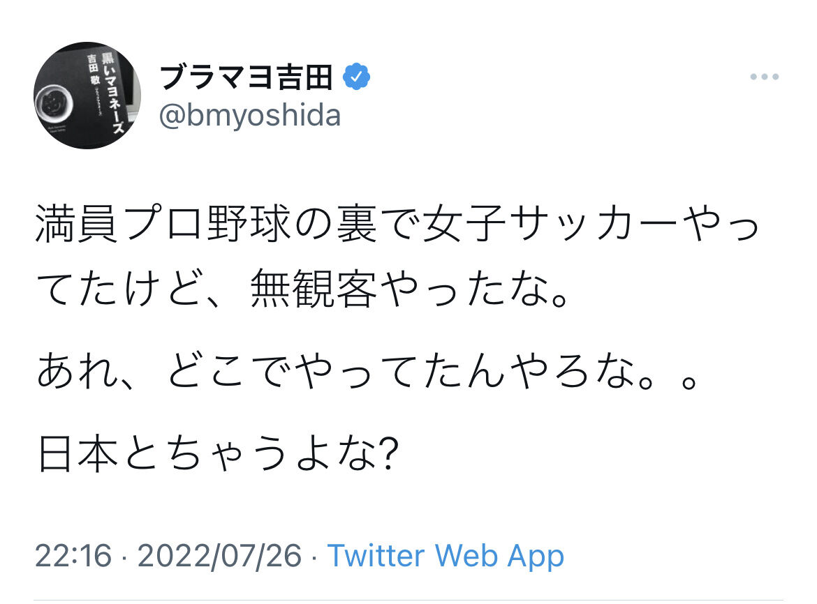 【悲報】ブラマヨ吉田さん、昨日有観客で試合をした女子サッカーを煽る「日本ちゃうよな?」【Eー1連覇おめでとう】