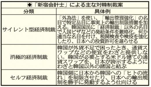 新宿会計士は「経済のプロ」の視点から、現実に発動可能で、韓国経済に打撃となる対韓制裁案を打ち出し、以下の3つのタイプに分類した。「韓国を黙らせる処方箋」といえる。