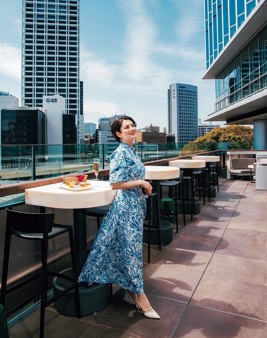 東京・虎ノ門にあるホテルのバーで撮影されたのもので、肌に溶け込むベージュのノースリーブワンピースを着用。うっとりするような美肌を見せ、上品にほほ笑んでいる。