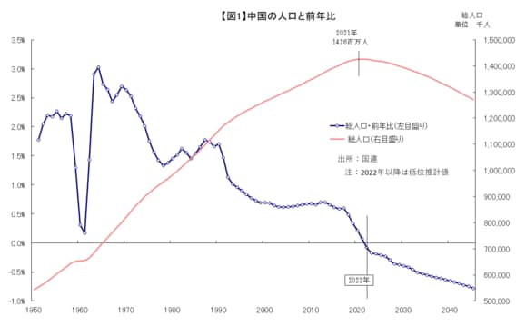 今年6月、国連の人口推計(World Population Prospects)が3年ぶりに更新されました。それによると、中国の人口は今年、1949年の建国以来、初めて減少に転じる見通しになっています(図1)。