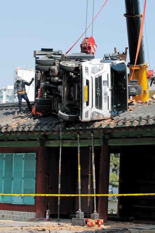 ソウル市鍾路区の成均館大学近くにある宝物第141号「文廟(びょう)」の東三門の屋根に高所作業車が落下し、建物の一部が破損した。東三門は朝鮮王朝時代、国王が祭礼に出席するため文廟に出入りする際に使用していた門だ。