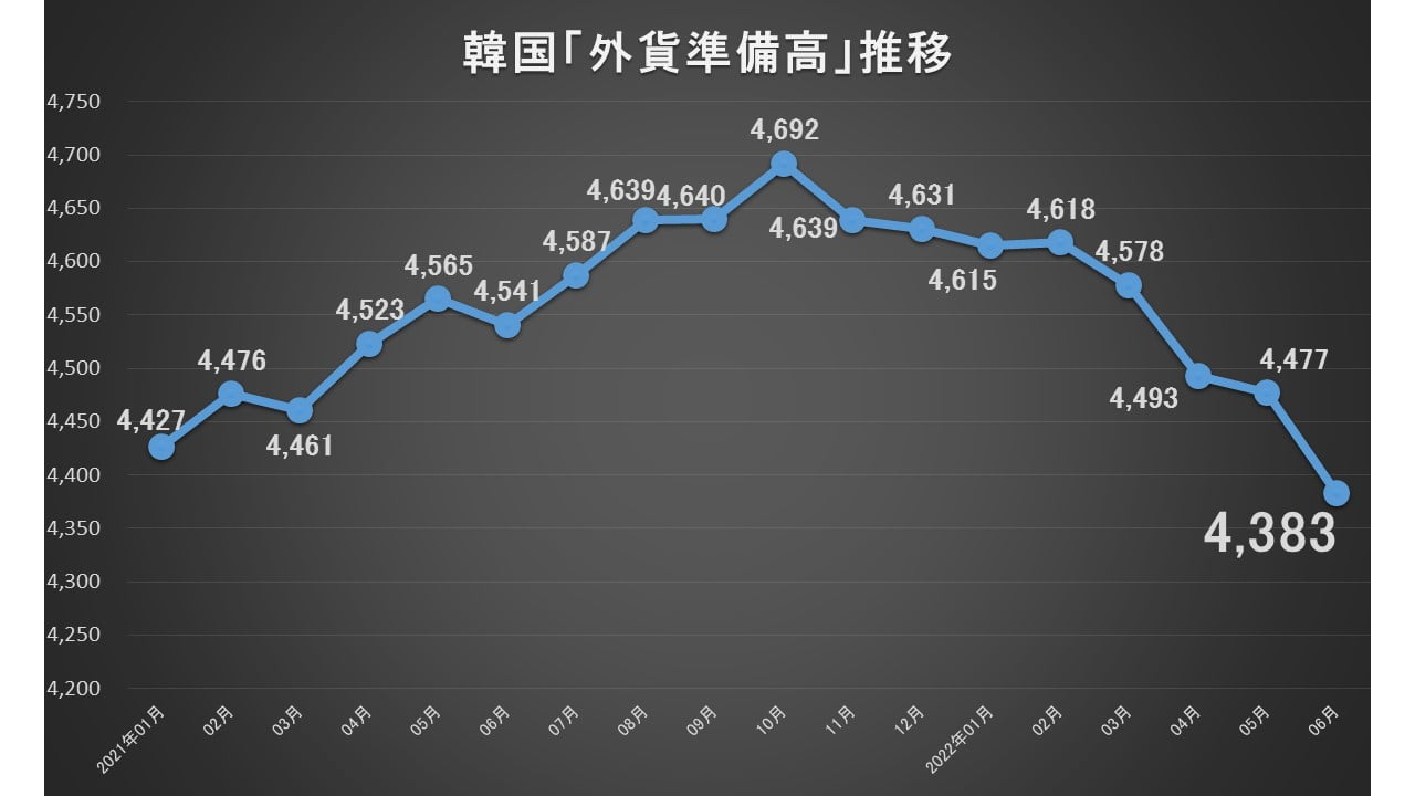 韓国の外貨準備高は2022年06月時点で「4,383億ドル」。4カ月連続で減少しています。