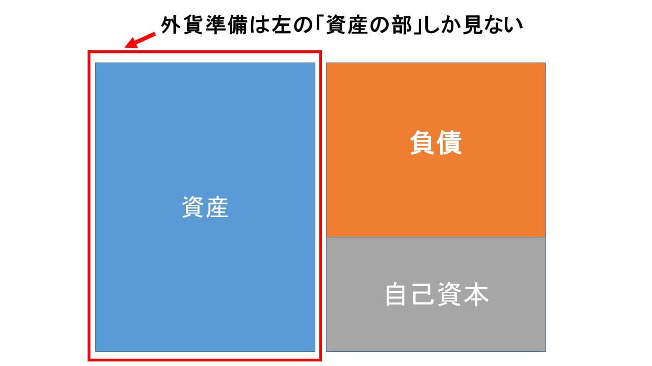貸借対照表でいえば、外貨準備高というのは左側の「資産の部」しか見ていません。また、中身について、具体的に「どんな資産なのか」は公表されていません。