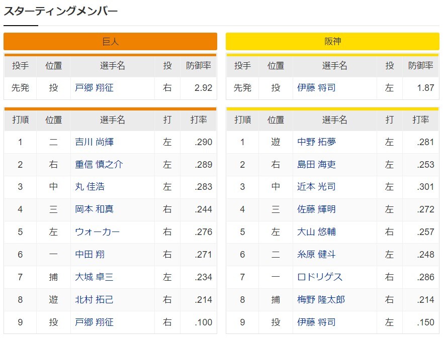 巨人ー阪神 スタメン 東京ドーム 2022/8/3