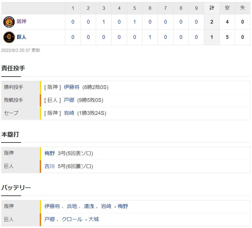 巨人1ー2阪神 試合結果 東京ドーム 2022/8/3